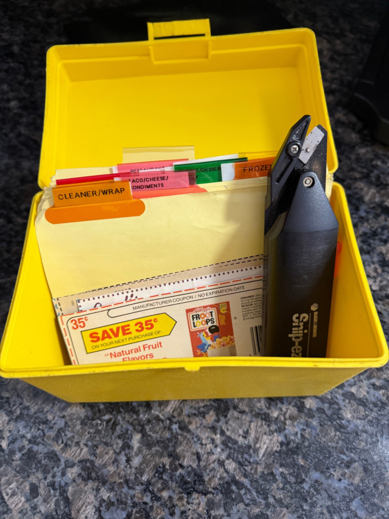 Moving closer to stand before this archeological find, My husband reverently opened the box. Inside were category tabs, a few remaining coupons and a Black & Decker Snip-ez. That’s right, we had a special tool used solely to cut coupons. This was very serious business.