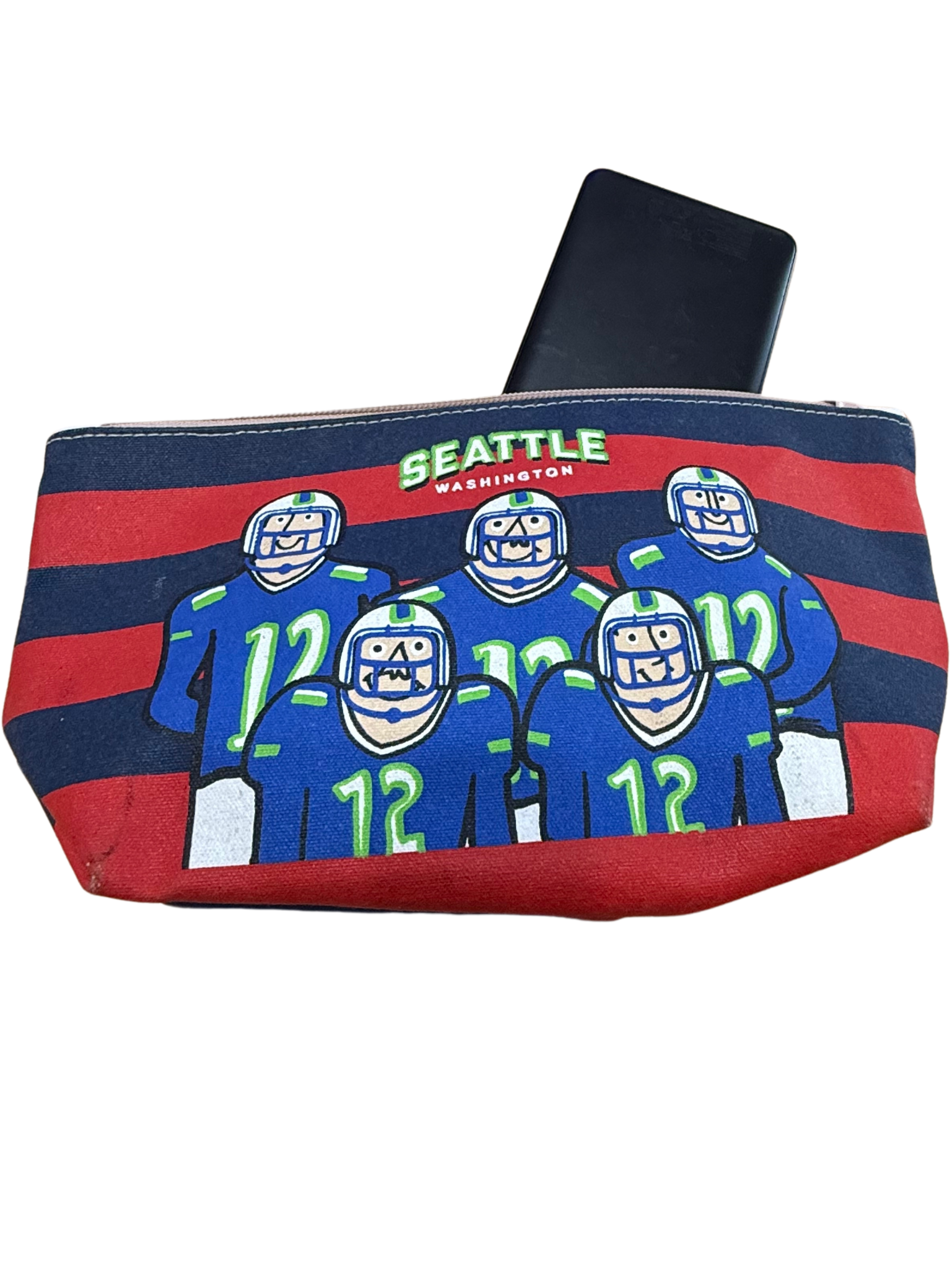 Fastforward a few days, we are at our rental house outside of Seattle. Twenty-four hours before we were to attend the Vikings vs Seahawks game, I bought my stadium-approved bag to the dining table, along with hats, gloves, ponchos, binoculars, chapstick, hand warmers, tissues and the Belkin power pack we take with us everywhere, so that we can charge our phones if necessary. The two of us went over each item as I loaded it into the bag that we would take into Lumen Field. The Belkin power pack is kept in a small Seahawks pouch my best friend, J, gave me years ago. Mister Rain had been charging our vest batteries that morning, now fully charged, he asked where he should put them. I told him to add them to the pouch and then put the pouch into the stadium bag.