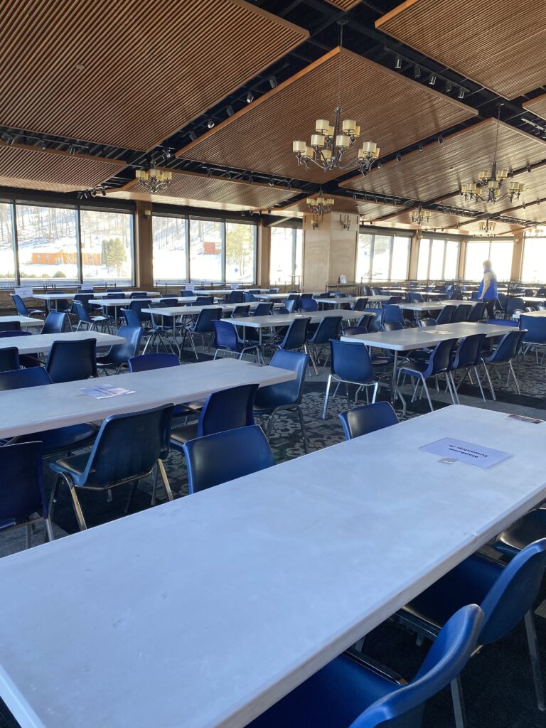 Exiting the elevator a few floors up, we found the room that Jay had mentioned. The view of the slopes was not that great, we were a bit disappointed. I sat down at an empty table while Mister Rain looked around. A few minutes later Jay appeared in front of me. “Come with me,” he said. I got up, walking behind him, my husband bringing up the rear. We didn’t go far before he stopped and moved a sign in front of some closed doors. Opening them, he motioned for us to enter. Here was a huge open room with the windows I had imagined. “Do people have wedding receptions here?,” was the first thing out of my mouth. It seemed the perfect setting. Jay confirmed that they do, describing a recent marriage that had taken place out on the snow before the party in this room afterwards.
