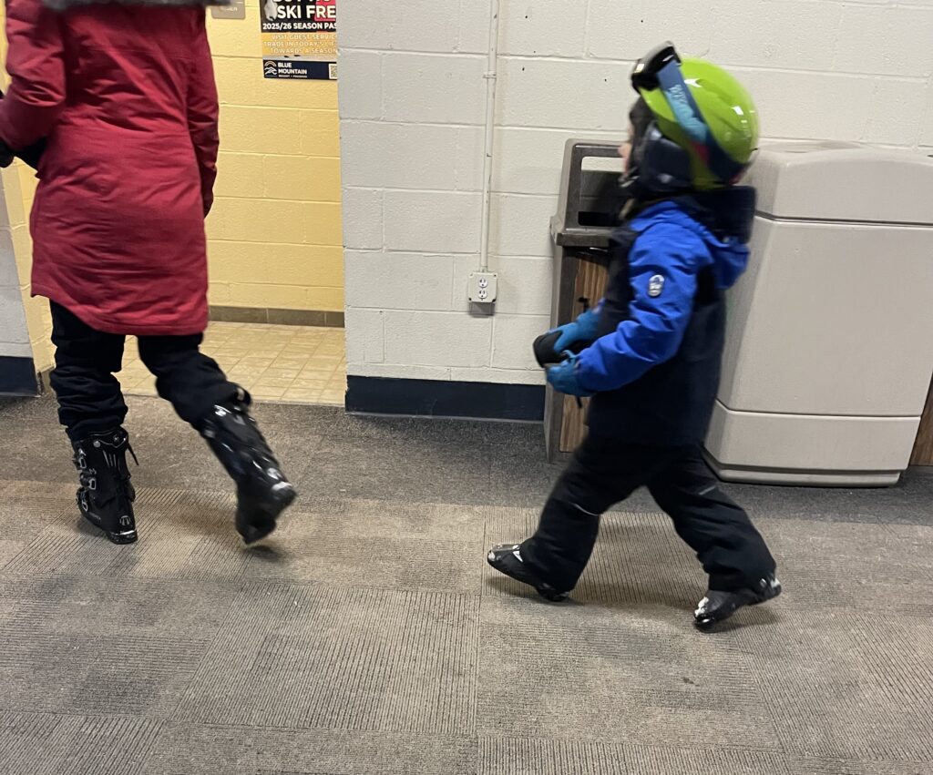 Parking in the lot once we arrived, we made our way into the single building marked as the lodge. I was expecting an apres-ski atmosphere but instead it was an industrial building full of people in ski gear hurriedly going this way and that, the sound of heavy boots and awkward walking – clomping, really – coming from every direction. We had no idea where to go. A Blue Mountain employee, Jay, must have seen our lost faces. He asked if he could help and I replied, “We’d just like to watch the skiers.” He pointed out where the elevator was located, telling us to go upstairs to a large public room. We thanked him, making our way to where he had directed, passing lockers along with skiers and snowboarders of all ages.
