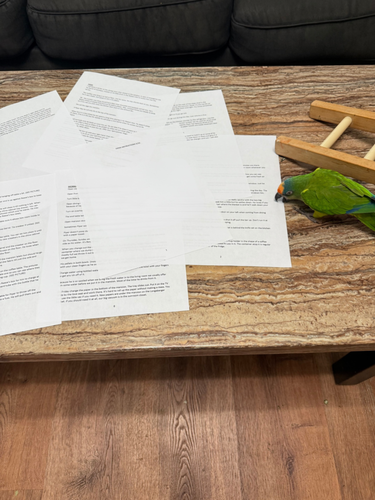 I sometimes try to compare the difference a pet sitter would find in staying with Piper versus a dog. Sure, Piper doesn’t have to go out to do his business or be walked, but if my 12-page of instructions are any indication, there is a lot that goes into not just feeding and watering our little man, but tending to his distinct personality and, I will fully admit, spoiledness.