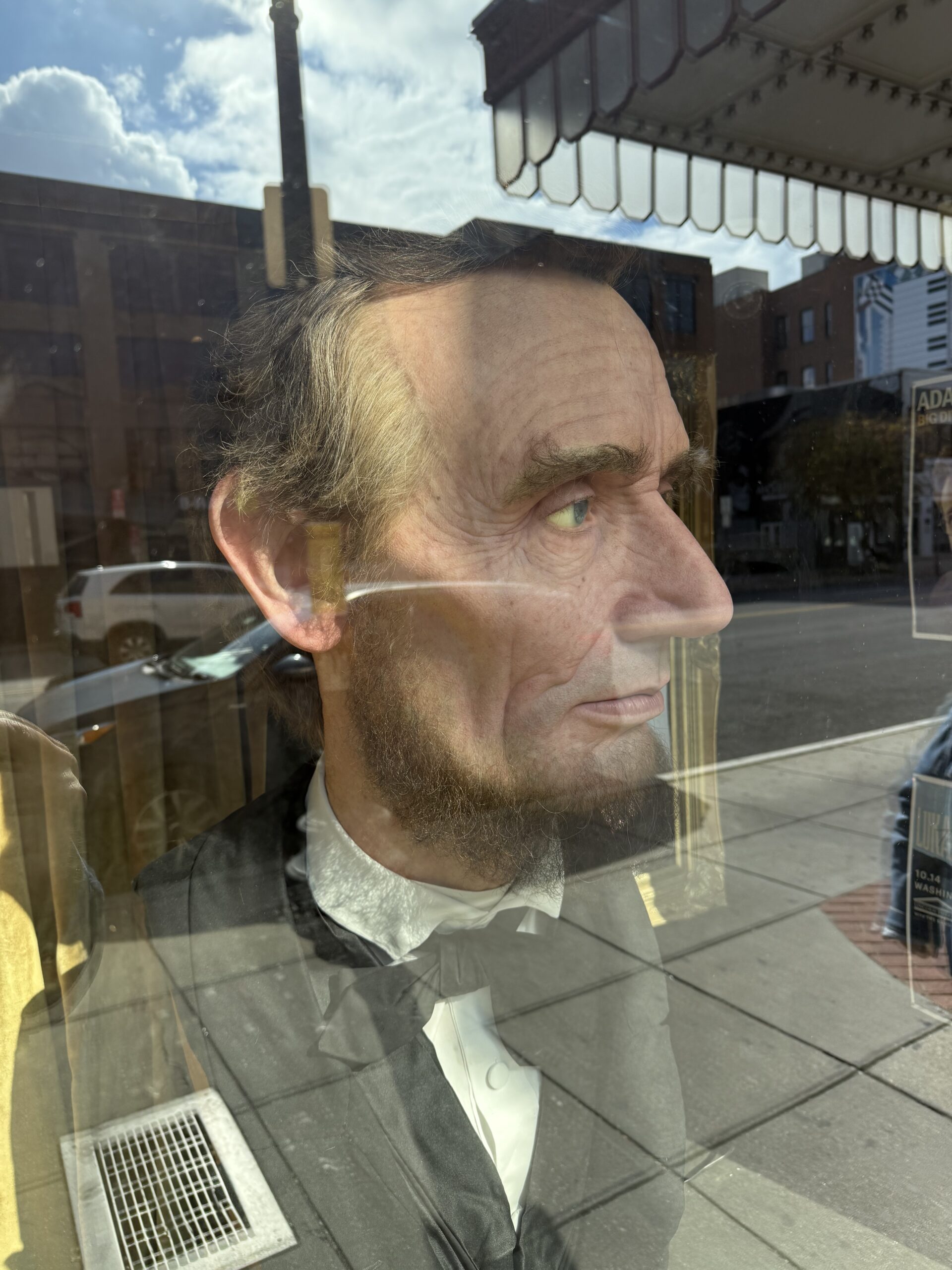 Displayed in the window of the Lincoln Theater in Washington, DC since 2017 (not to be confused with that other theater), is a twice life-size, full-color, hyper-realistic head of President Abraham Lincoln.