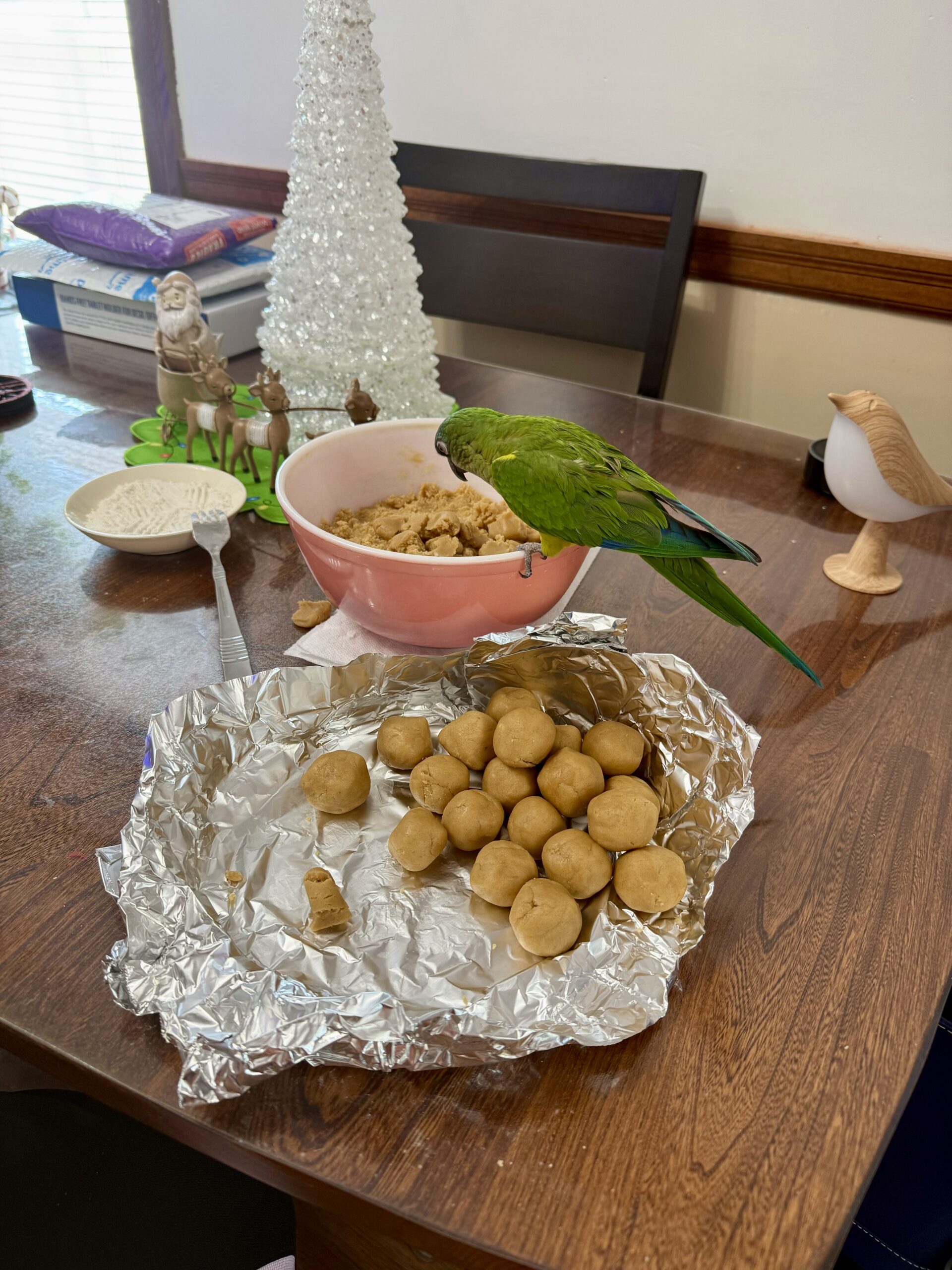 As I rolled peanut butter cookie dough into small balls to get ready for baking, I could feel Piper’s eyes on me from the room next to where I sat. It didn’t take long for the squawking to begin, as always, starting out as soft cooing sounds, then slowly ramping up to bloody murder.