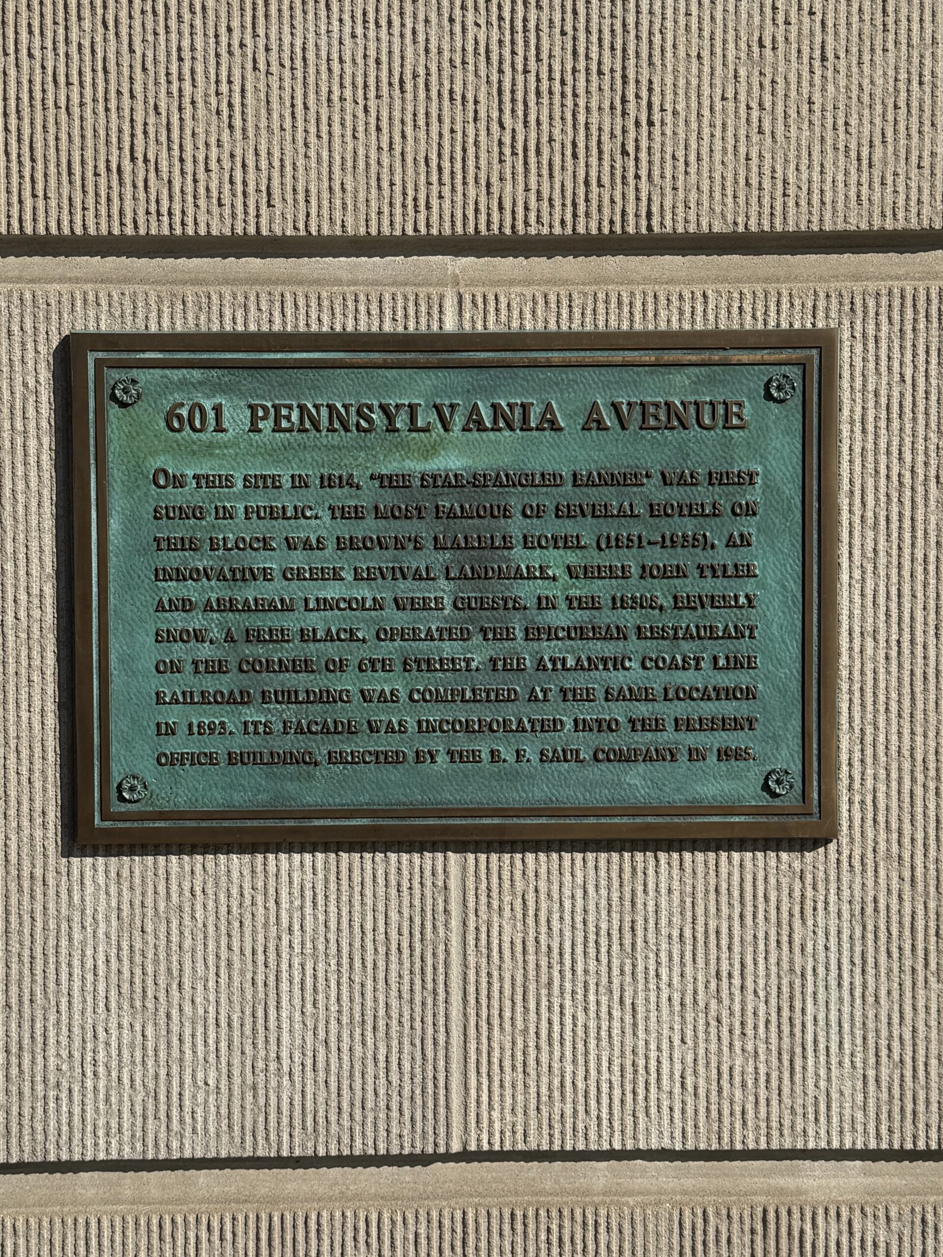 I was excited to visit the location of the first singing of “The Star-Spangled Banner,” marked by a plaque, in Washington, DC. My husband and I had a little difficulty finding it, GPS kept sending us to a SW address, when we needed NW. Before we realized this, Mister Rain walked all around the area trying to find the building and marker.