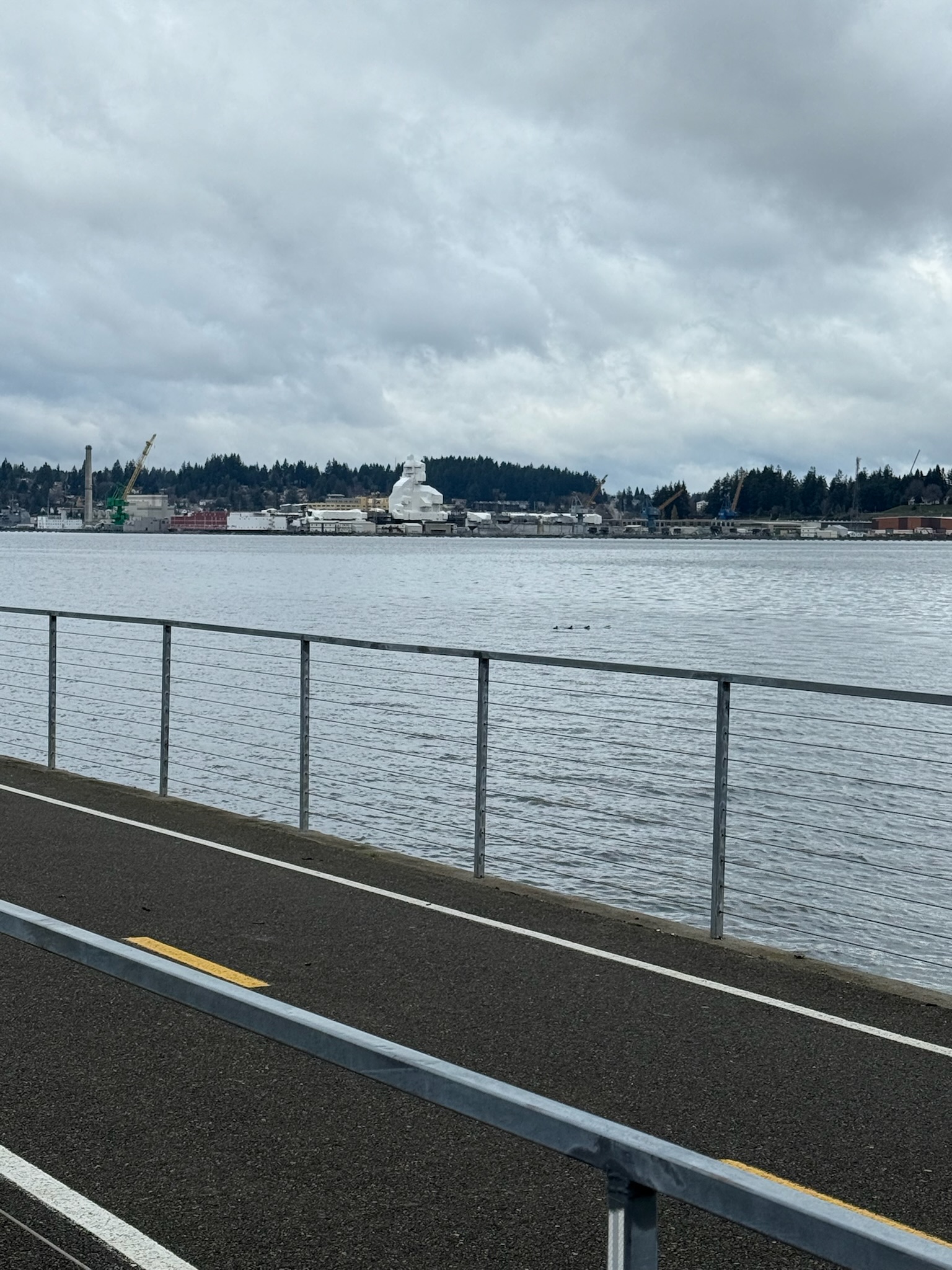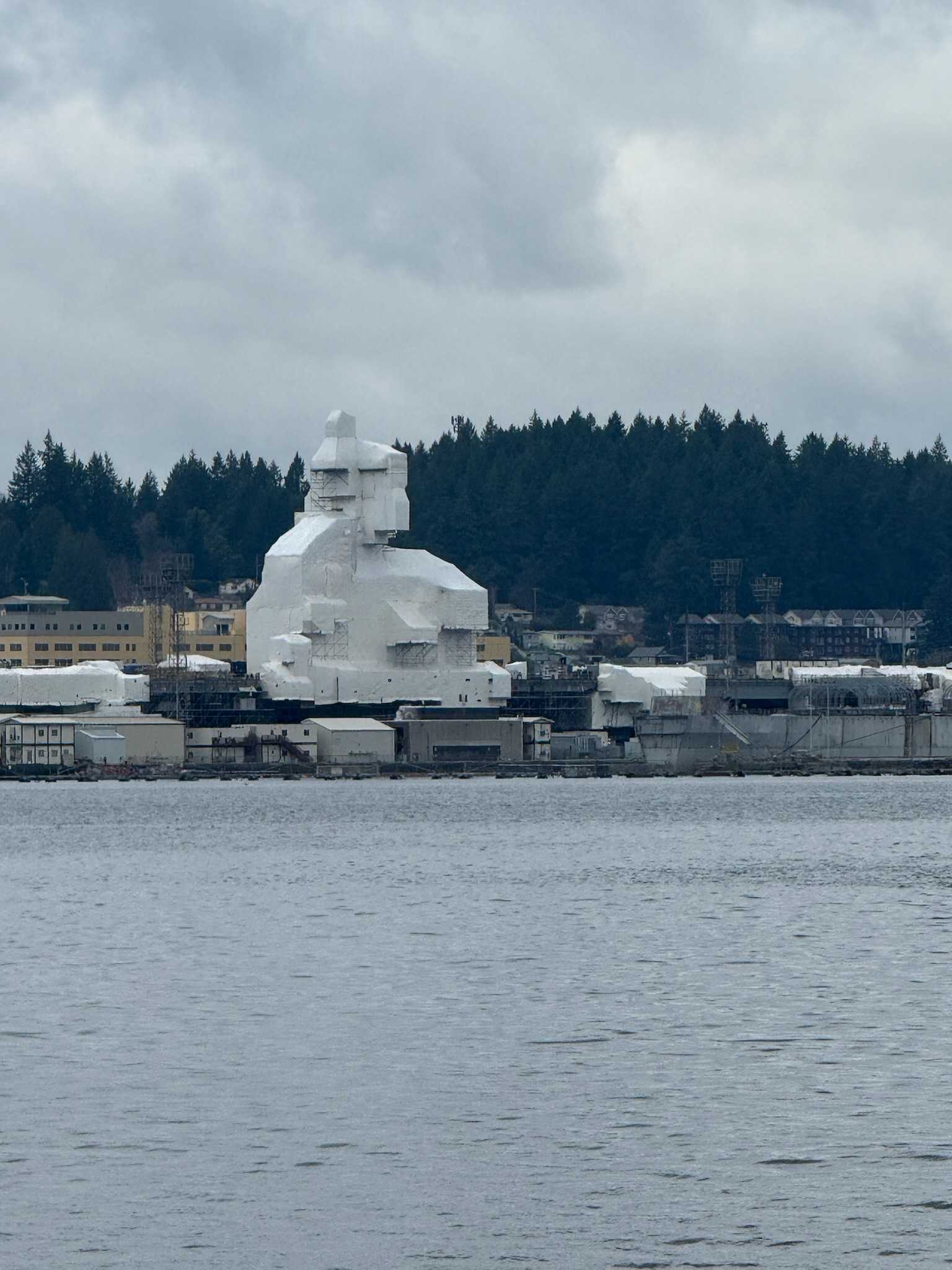 The next day, we parked in a lot so that the new addition in Bremerton was a straight shot from us on the other side of the water. Using binoculars, Mister Rain tried to determine what it was. “It looks like a building that’s wrapped,” was his report.