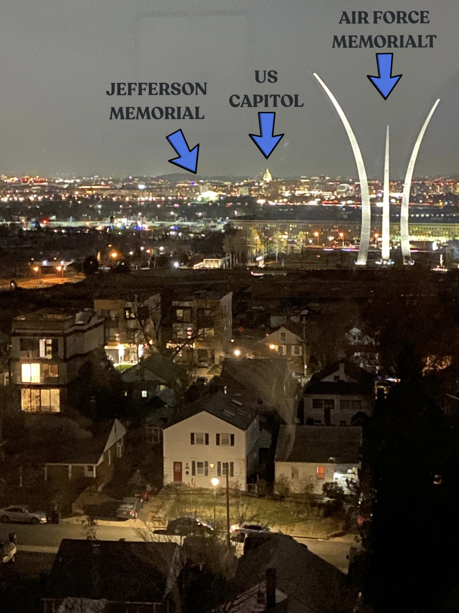 Seeing the monuments from above, covered in white after an overnight snowfall, as I wrote about in The Snow Below (click here), our Nation’s Capital is equally compelling at night. With homes in the forefront, the city’s lights surround its structures like twinkling stars, and the memorials seem to glow from within.