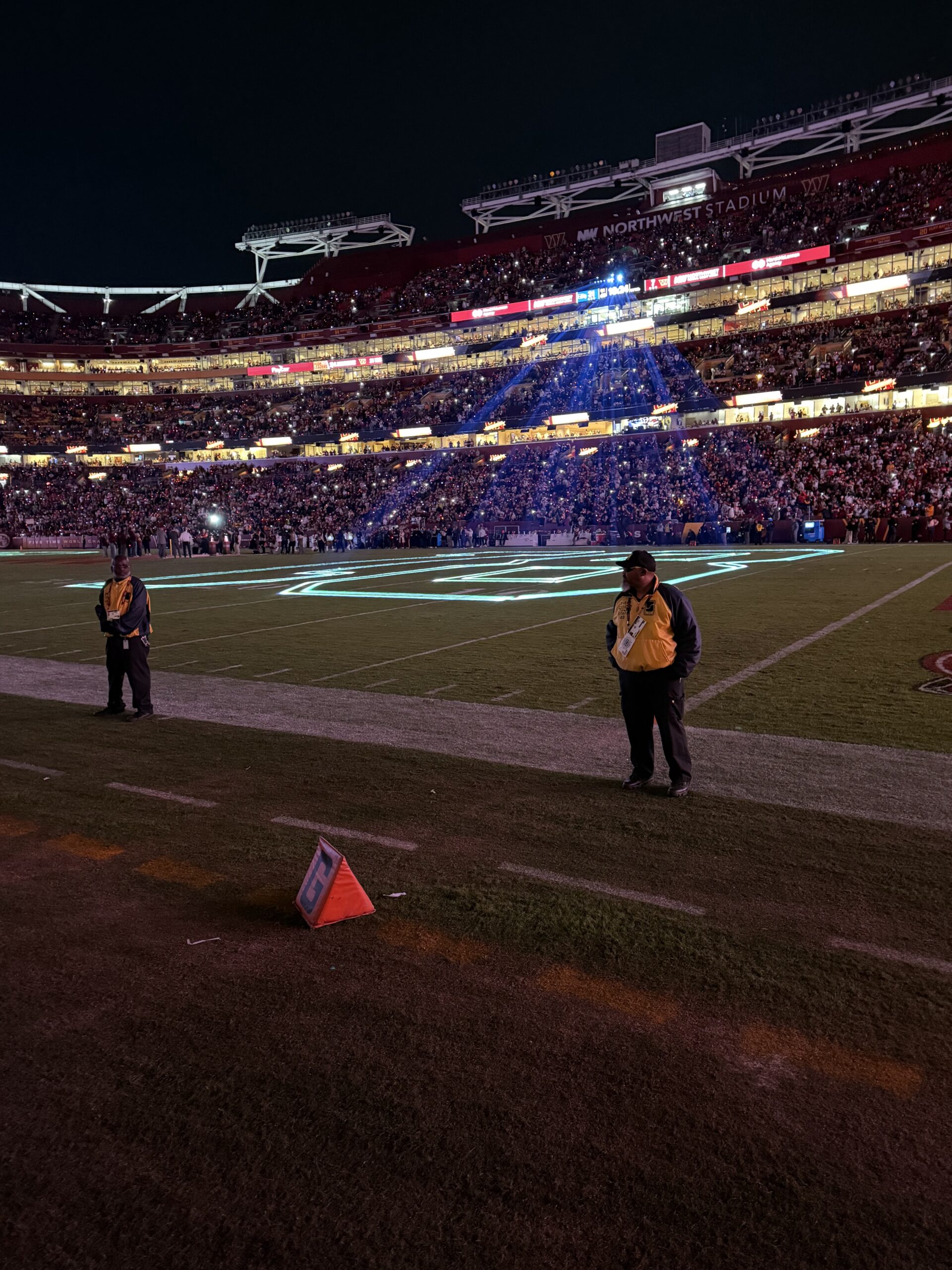 Attending any live sporting event is exciting, but there is an extra thrill when it takes place in the evening. The Seahawks versus Commanders matchup was a Sunday Night Football game, with kickoff at 8:00 pm. Although we were not rooting for the home team, the festivities prior to the coin toss got the crowd hyped up, including us. Our Seahawks put on a show, beating the Commanders 38-14. But the show that Northwest Stadium put on wasn’t half bad either.