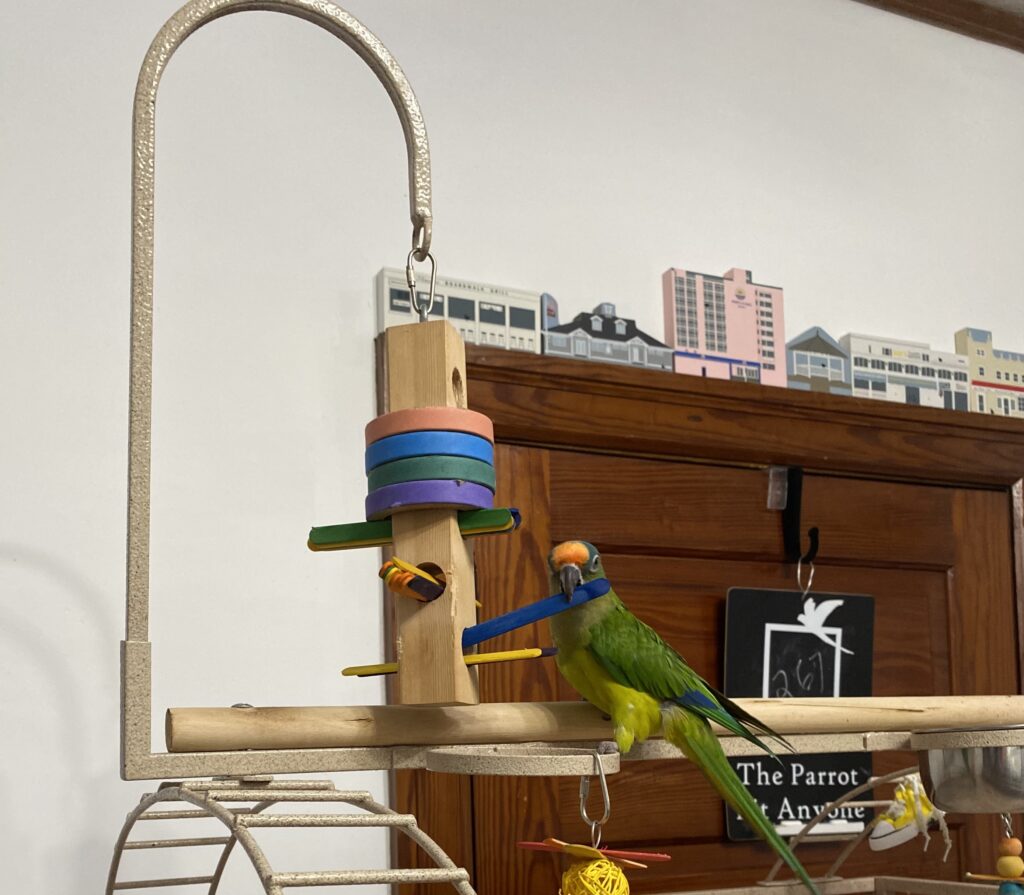 Something you may not know is the amount of time you spend on the floor when you are sharing your life with a parrot. One of Piper’s favorite things to do is throw his toys on the ground. If he is alone he won’t do it but once we are in the room, off they go, because he knows we will pick them up. Should we not do so in a timely manner according to our Lord and Master, his soft coos will escalate into screams which, when translated, mean, “PICK UP MY TOYS!!!”