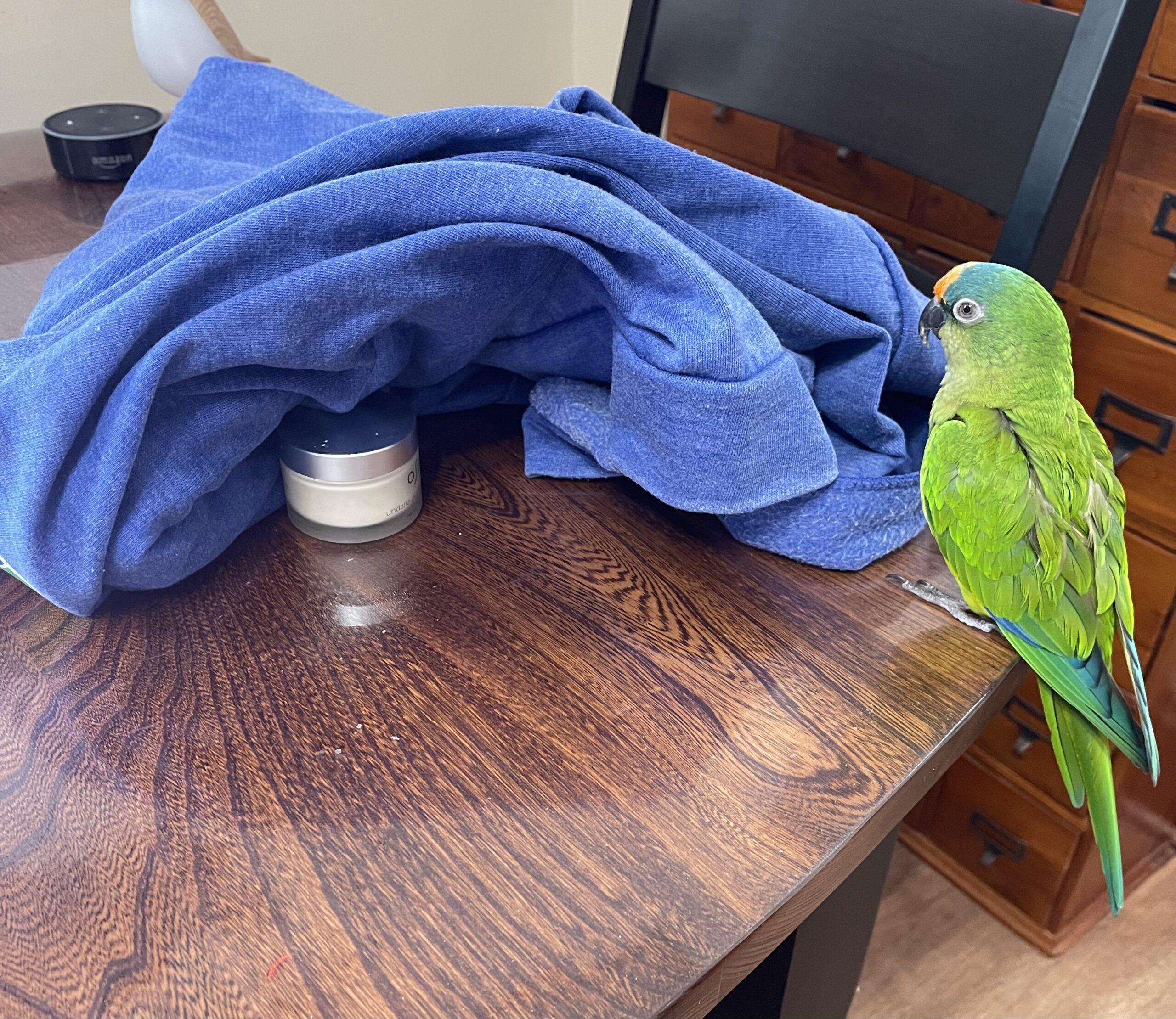 I remember how much fun building a fort with the sofa cushions and some blankets was when I was a kid. I know Piper loves to explore any opening, always cautious but infinitely curious. Working in the dining room, Piper climbed down my arm to the table, looking for something to play with. I grabbed my sweatshirt off the nearby chair and also my jar of skin moisturizer.