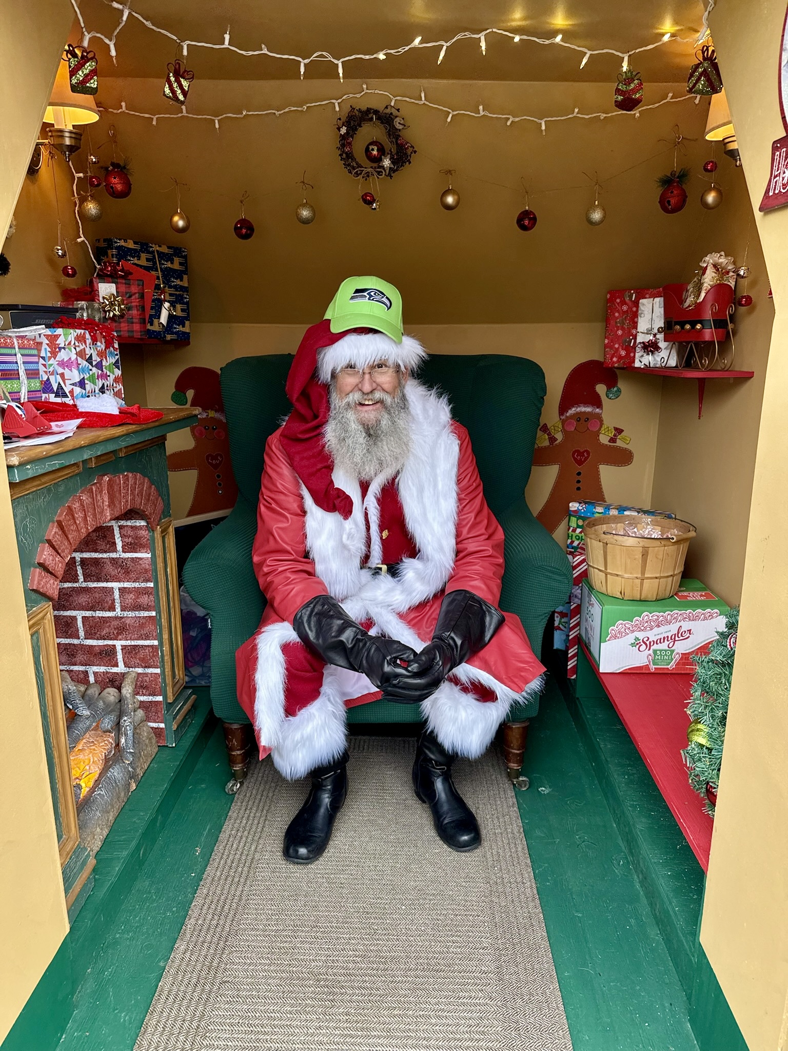 It was the Saturday after Thanksgiving and when we got out of our car, there was Santa, sitting in his tiny house, greeting people walking by and taking photographs. I asked Santa to put on my Seahawks baseball cap directly on top of his own well-known chapeau so that I could take a picture of him. “Santa” took the hat while informing me, “Santa is a Chiefs fan.” Apparently Santa’s first name is not Kris, but rather Bill, who, before he moved to the North Pole, was from Kansas City.