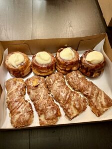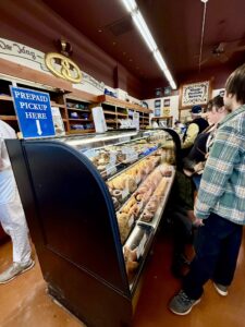 Once inside, the delicious scents increased by a baker’s dozen. The line moved quickly, we almost didn’t have enough time to survey the many different sweet treats in the display case before it was our turn to order. Everything looked as good as it smelled; it was sensory overload even for a visually impaired person.