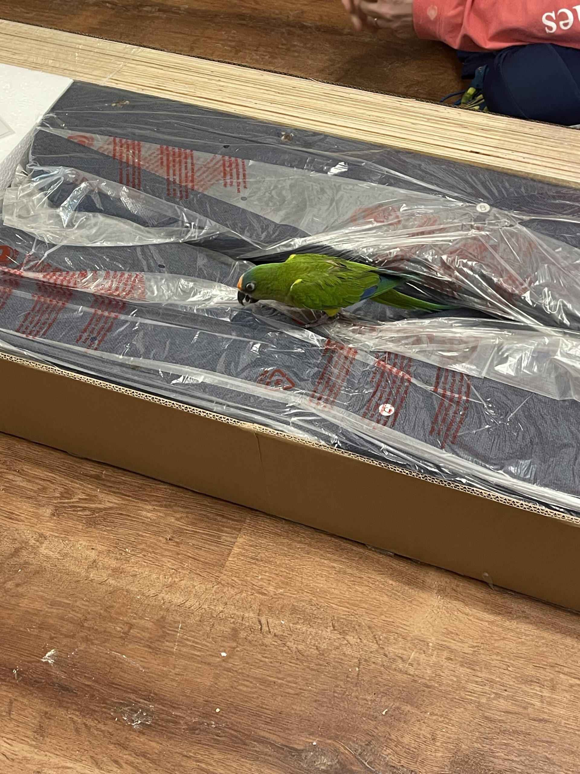 Piper loves a plastic bag, even a Ziploc will get him running to give it a chew. So when he heard the rustling of the new bed components’ packaging, he had to check it out for himself. He walked around, almost strutting with glee at the noise his little feet made on the plastic.