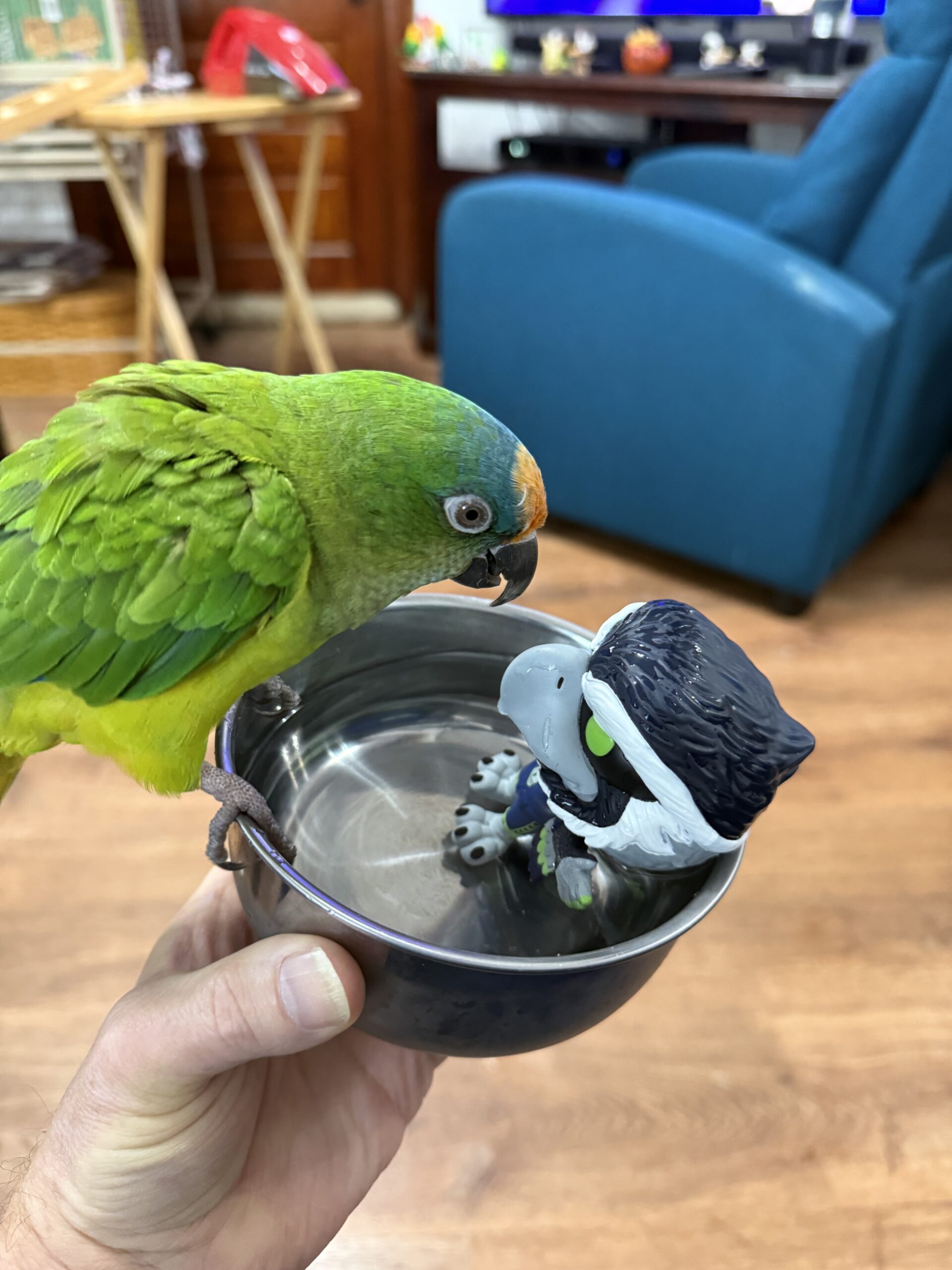 I bought a Funko figure of Blitz, the Seahawks’ mascot, for Piper, although I had an offsides feeling it would result in a too-many-birds-in-the-house penalty and I would be ejected from the game.