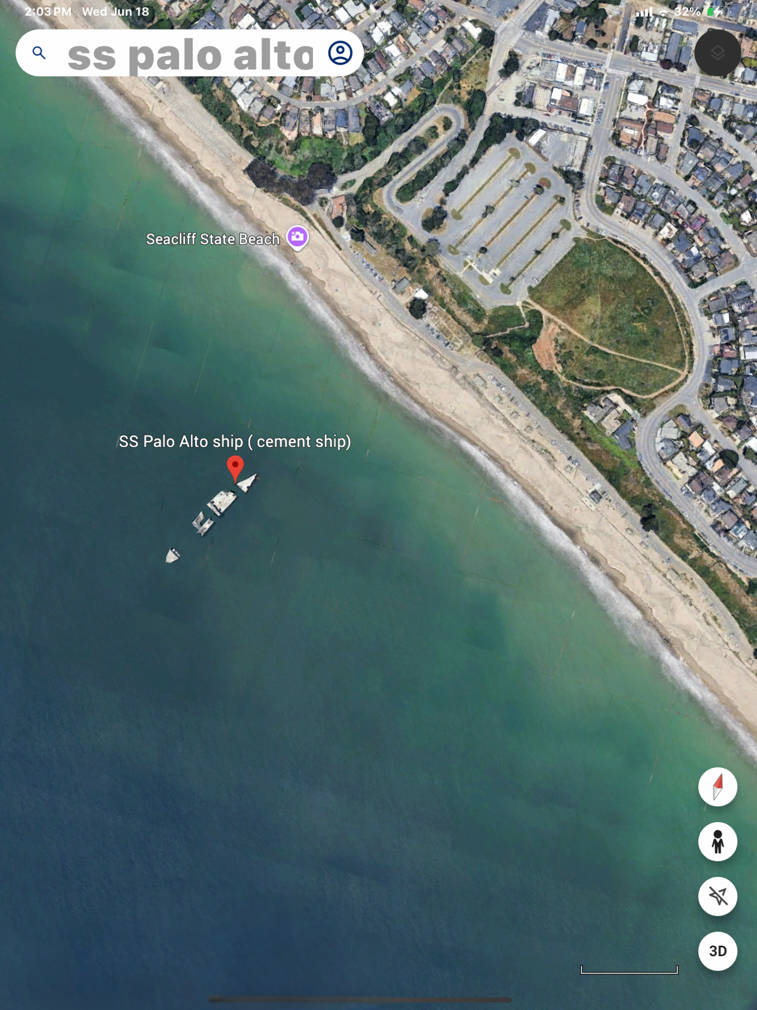 On her maiden and only voyage in 1929 the ship was towed from Oakland to Seacliff State Beach in Aptos, California to be grounded there and converted to an entertainment venue. Once positioned at the beach, the valves were opened and the 420′ Palo Alto settled to the ocean bottom.