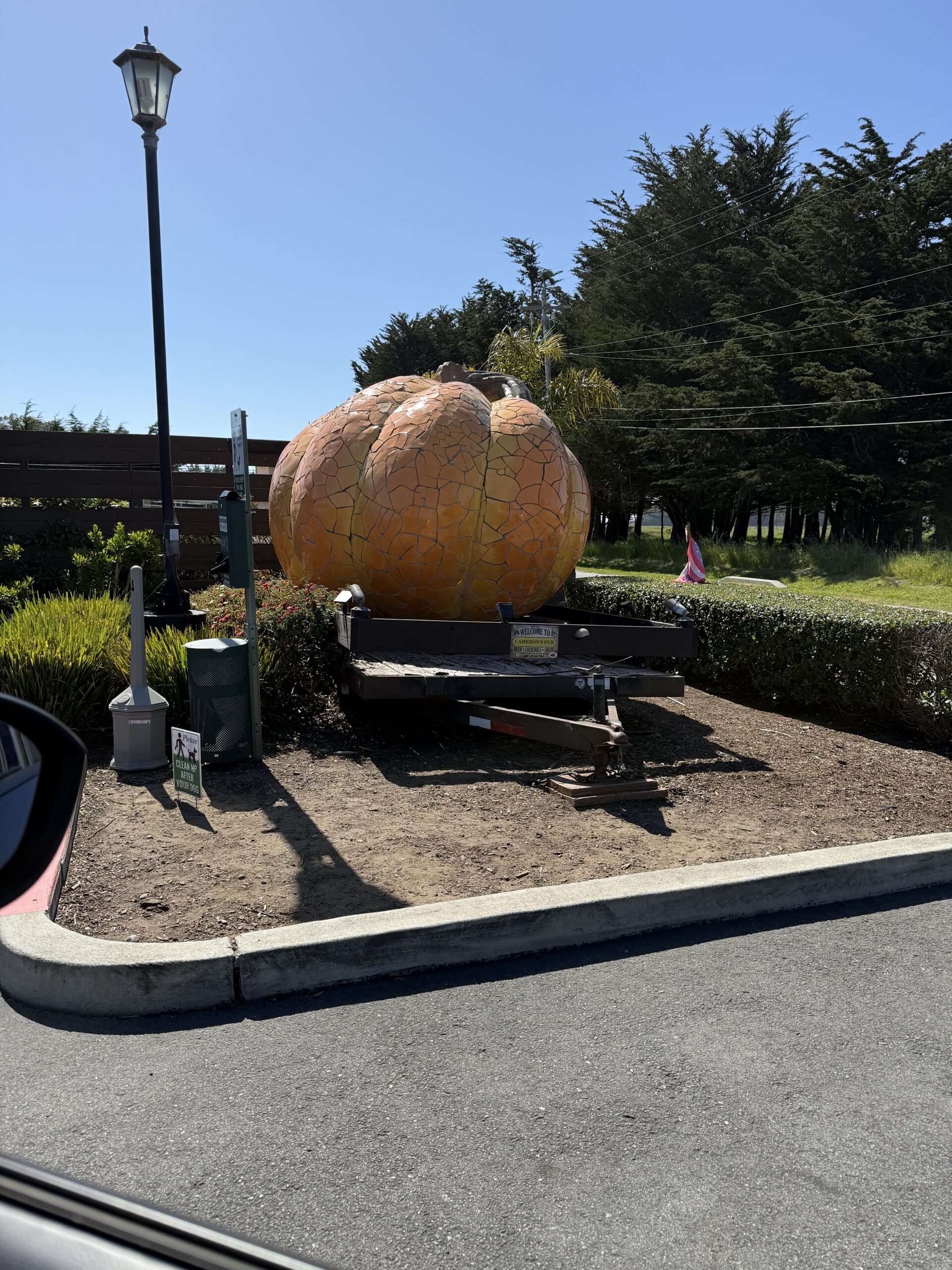 In addition to the British flare, there is a giant pumpkin in the parking lot. The 5-ton orange gourd is the World’s Largest Sculpted Pumpkin, created by Peter Hazel. Half Moon Bay has an annual Pumpkin Festival, so maybe that explains The Great Pumpkin in the midst of the English iconography. Maybe. All bets are off when it comes to roadside attractions.