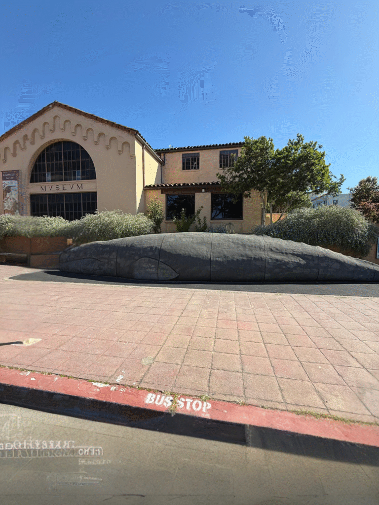 A life-sized sculpture of a gray whale, Sandy resides along the walkway outside the Pacific Grove Museum of Natural History.