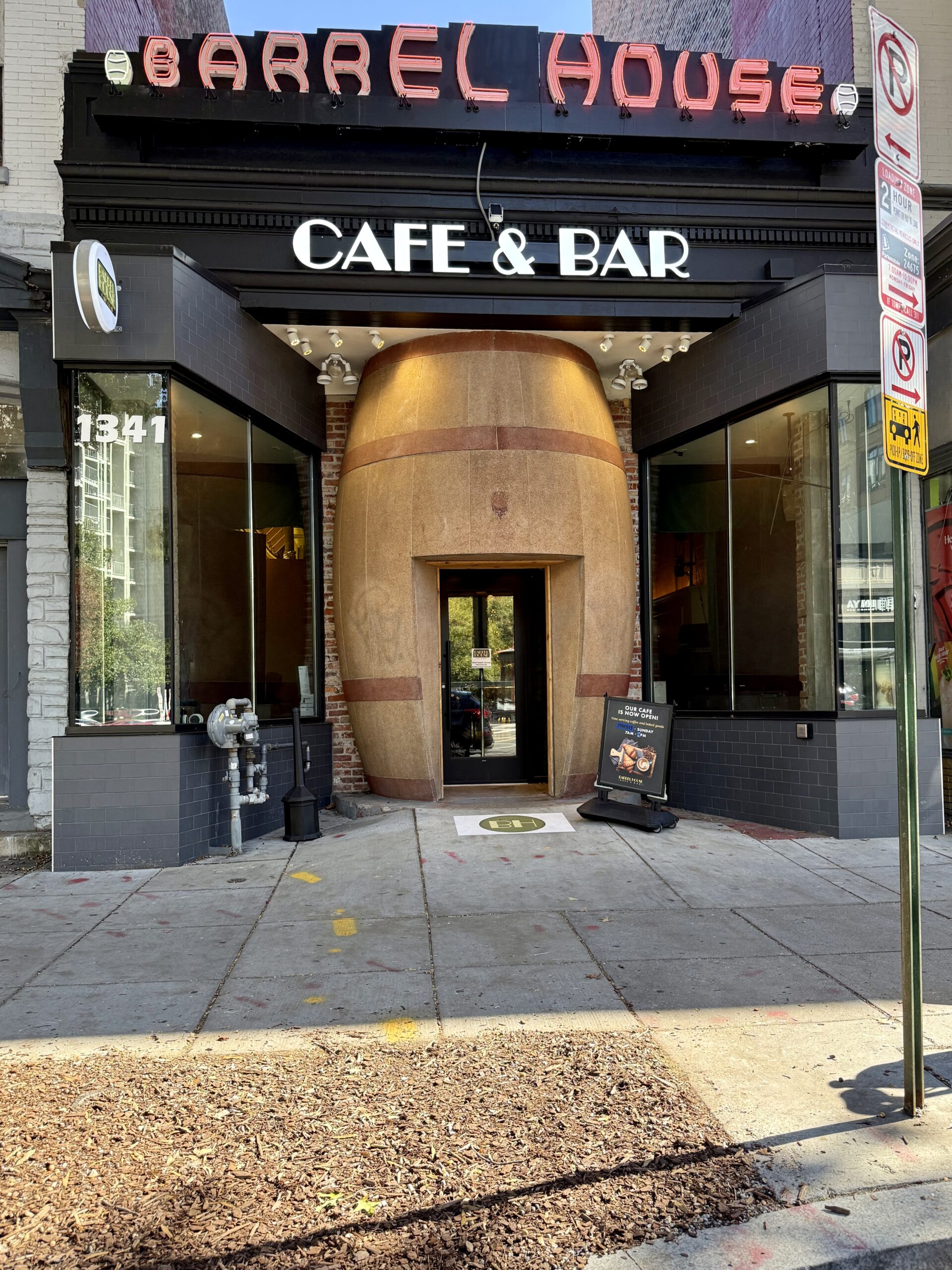 The iconic whiskey barrel doorway dates back to circa 1945, when the location was a liquor store. Now it is a cafe and bar / restaurant, sure to be a barrel of fun.