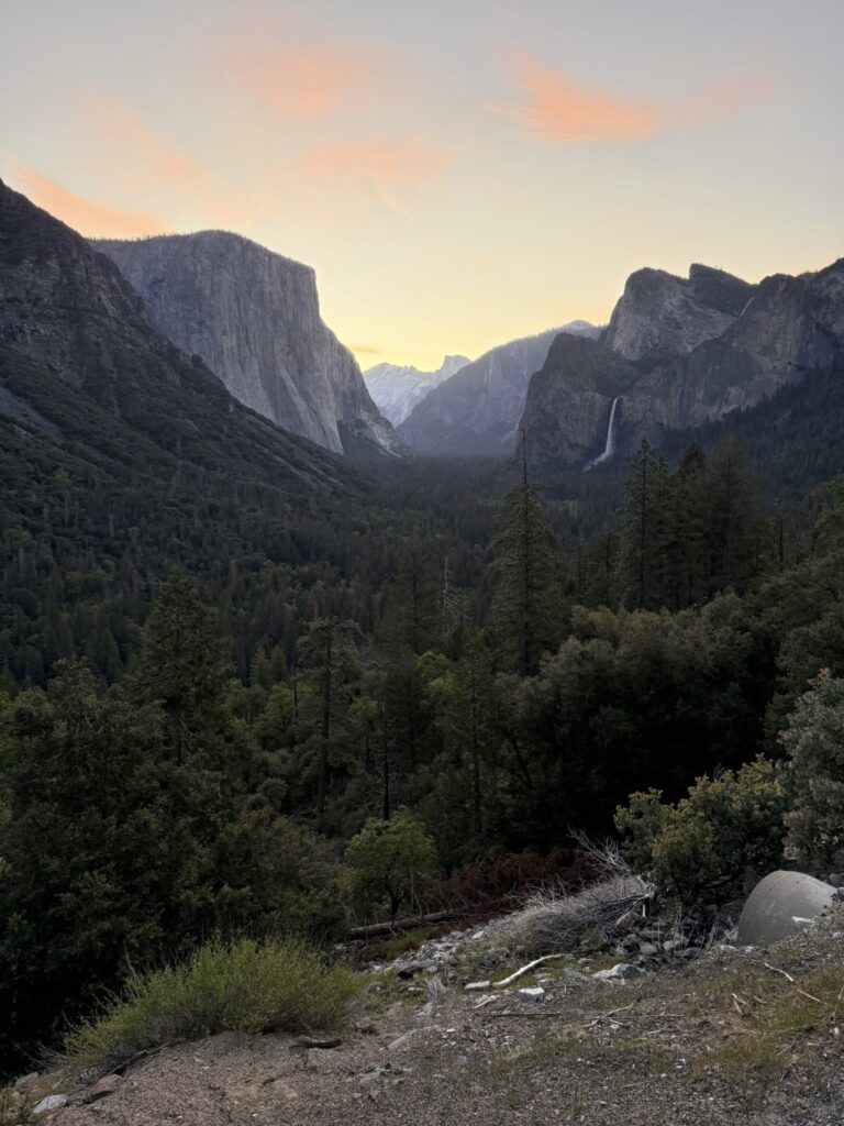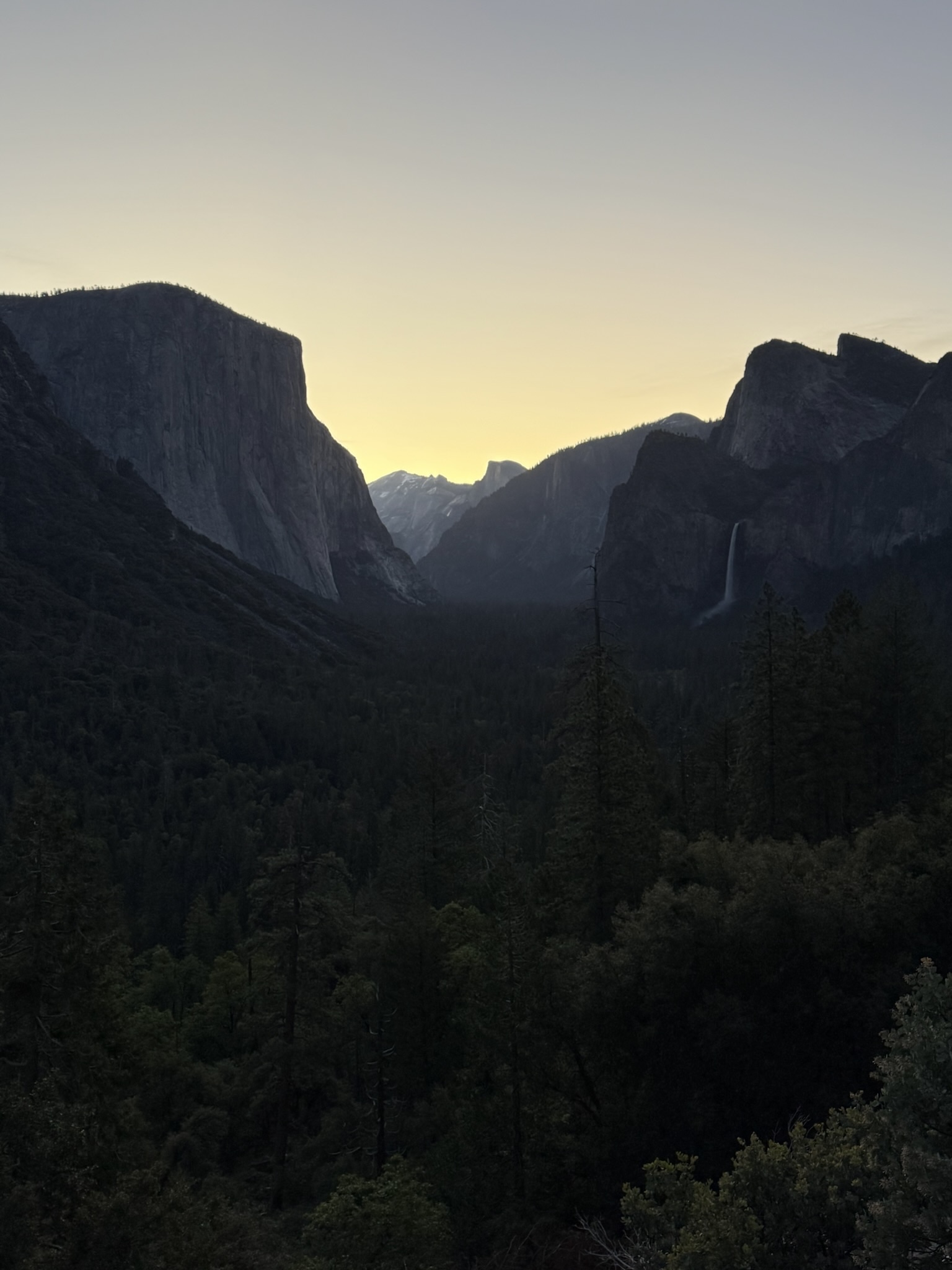 Driving in pitch blackness from our hotel to Tunnel View in Yosemite, 5 am was unexpectedly beautiful. The surrounding barely visible ancient massive rock formations seemed to cradle us as we moved through the valley thousands of feet underneath them.