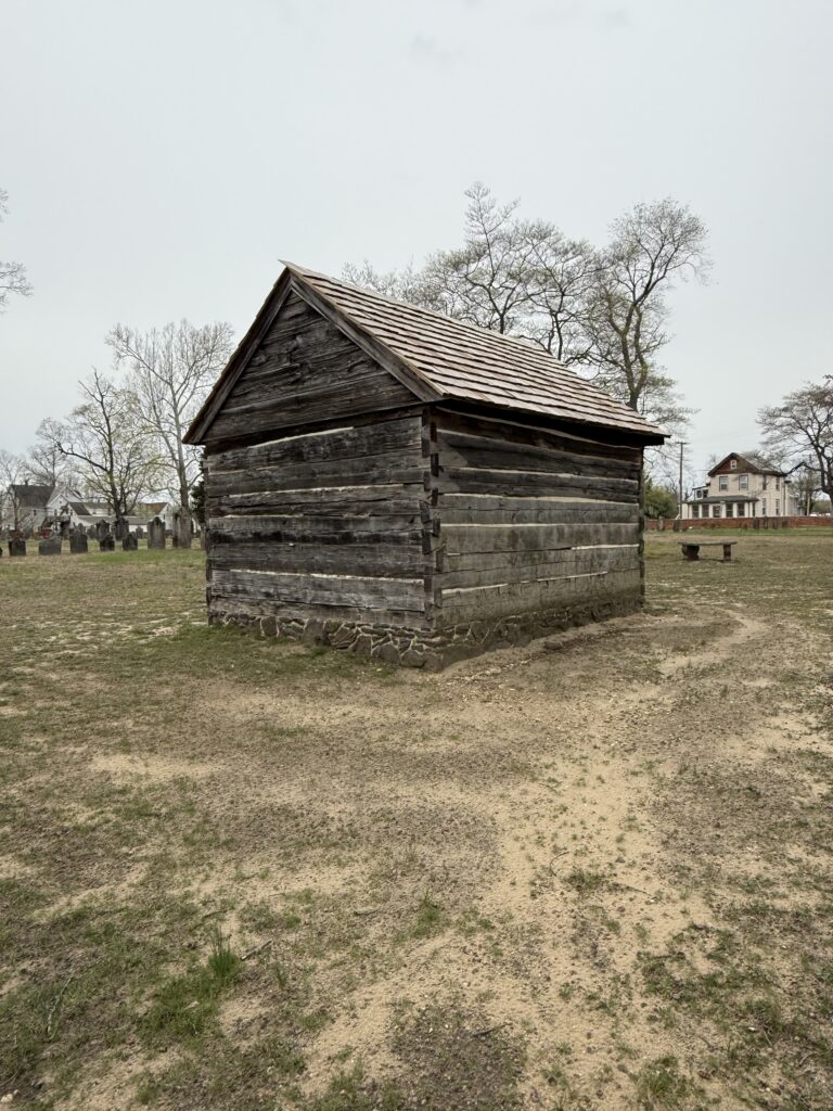 Across the cemetery from the church is the historic Schorn Log Cabin, built circa 1700 by by Morton Mortenson, a Swedish-Finnish man who arrived in the Delaware Valley in 1654. His great-grandson, John Morton, would go on to sign the Declaration of Independence as a Pennsylvania delegate. The cabin consists of one small room with no windows and a single door. Its walls are made of cedar logs.